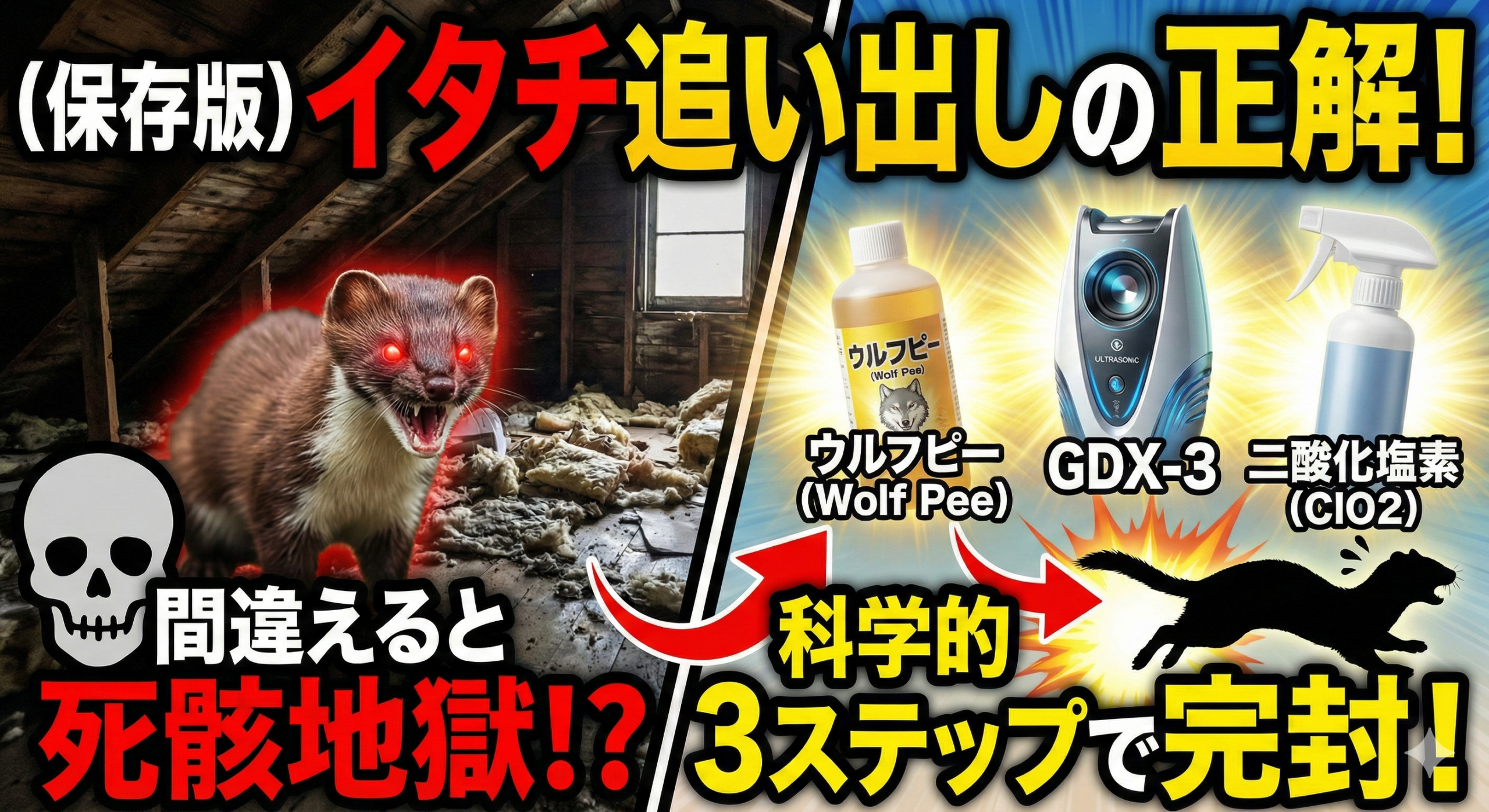 「臭い」と「音」のダブルパンチで、あなたの家を「不快な拷問部屋」に変貌させます。ここまで追い込めば、イタチは自ら逃げ出さざるを得ません。