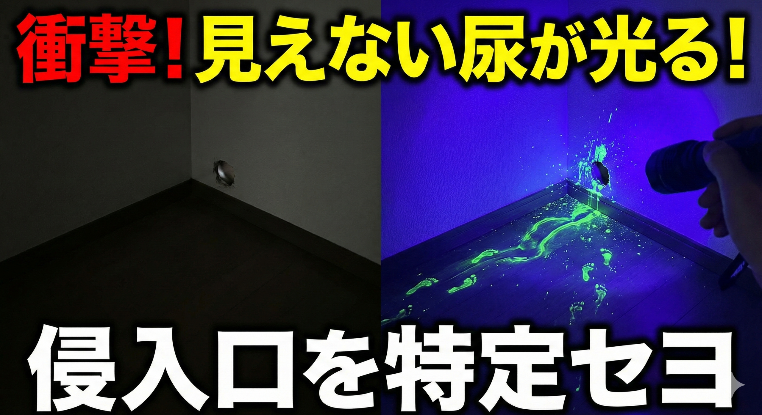 肉眼では全く見えない壁や床も、特定の光を当てるだけで豹変します。 闇の中でUVライト(ブラックライト)を照射した瞬間。 ネズミが歩き回った「光り輝く航跡」が、鮮明に浮かび上がるのです 。