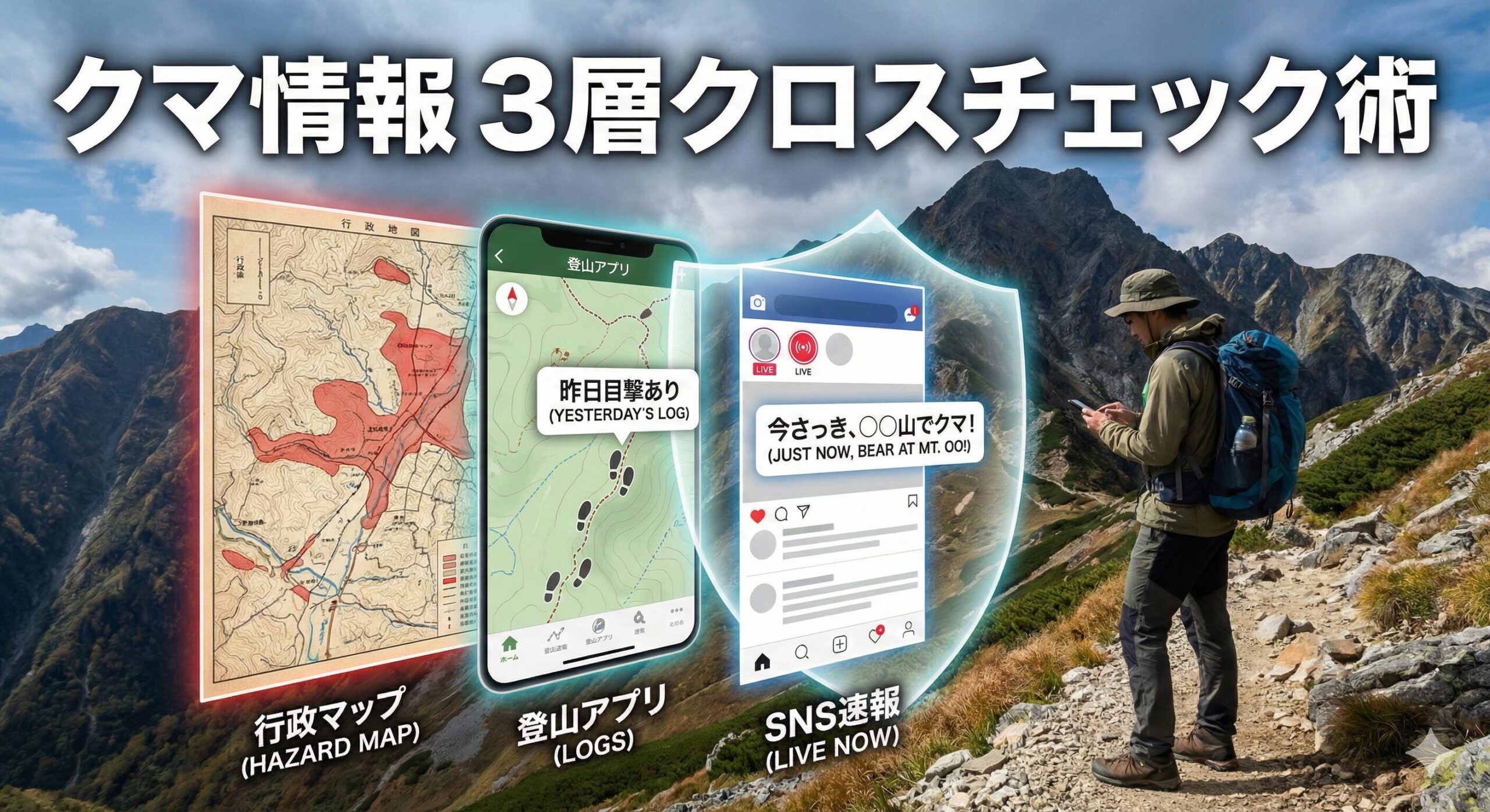 今回は、行政のマップ、登山アプリ、そしてSNSを組み合わせ、情報の「鮮度」を見極めるための「3層クロスチェック術」を解説します。クマ撃退スプレーを買う前に、まずは「正しい情報」という最強の装備を身につけましょう。